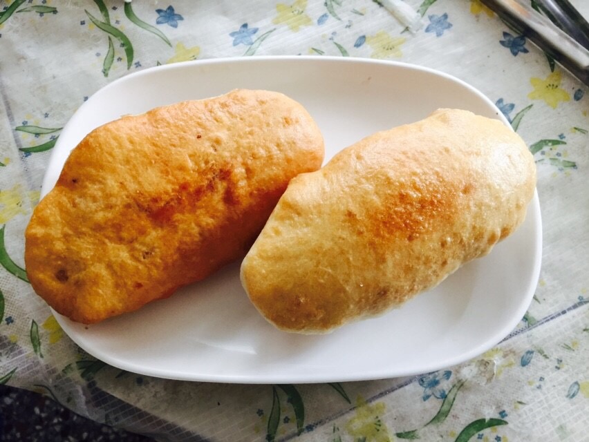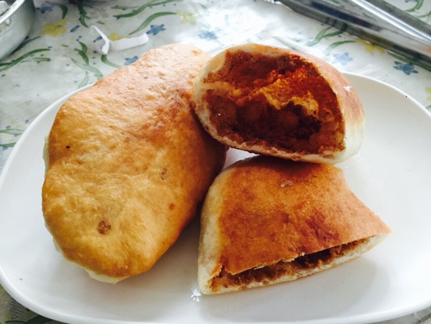 高麗菜煎餅,外皮為麵粉揉製成之麵皮,內饀有花生粉,細砂糖。